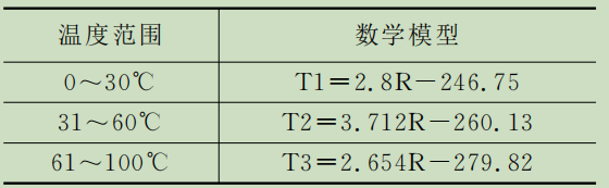 PT100電阻的電阻值和溫度具有線性關(guān)系 ,不同的溫度會(huì)轉(zhuǎn)換成PT100兩端不同的電壓信號(hào),電壓信號(hào)通過(guò)A/D轉(zhuǎn)換得到對(duì)應(yīng)的A/D值,所以可以根據(jù)電路中實(shí)測(cè)的A/D值以查表的方式計(jì)算相應(yīng)的溫度值。在較大的溫度范圍內(nèi),PT100電阻與溫度的線性關(guān)系不一致,而在某段小范圍內(nèi),兩者的線性關(guān)系較好,因此,在系統(tǒng)中采用查表與分段數(shù)學(xué)建模相結(jié)合的方法計(jì)算得出較精確的溫度值。算法將測(cè)溫范圍 分 成0℃~30℃,31℃~60℃,61℃~100℃3段。在每段溫度區(qū)間內(nèi),對(duì)A/D采集到的電壓溫度信號(hào)值的大小與PT100阻值大小的關(guān)系根據(jù)實(shí)際情況進(jìn)行數(shù)學(xué)建模。分段數(shù)學(xué)模型如表1所示。根據(jù)此數(shù)學(xué)模型得到測(cè)量理論誤差小于0.1℃,實(shí)際測(cè)量過(guò)程中溫度最大偏差量也小于0.1℃,滿足系統(tǒng)測(cè)量精度要求。