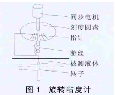 同步電機以穩定的速度旋轉,連接刻度圓盤,再通過游絲和轉軸帶動轉子旋轉。如圖1所示,如果轉子未受到液體的阻力,則游絲、指針與刻度圓盤同速旋轉,指針在刻度盤上指出的讀數為“0”;反之,如果轉子受到液體的粘滯阻力,則游絲產生扭矩,與粘滯阻力抗衡最后達到平衡,這時與游絲連接的指針在刻度盤上指示一定的讀數(即游絲的扭轉角)。將讀數乘上特定的系數即得到液體的粘度(mPa·s)。