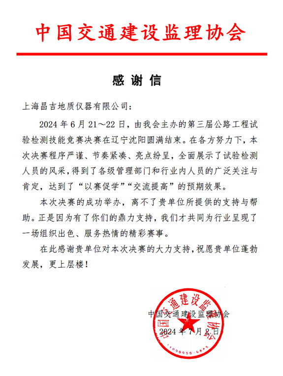 導讀:第三屆全國公路工程試驗檢測技能競賽決賽賽后上海昌吉收到中國交通建設監理協會主的感謝信